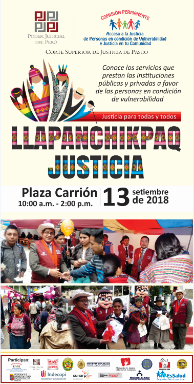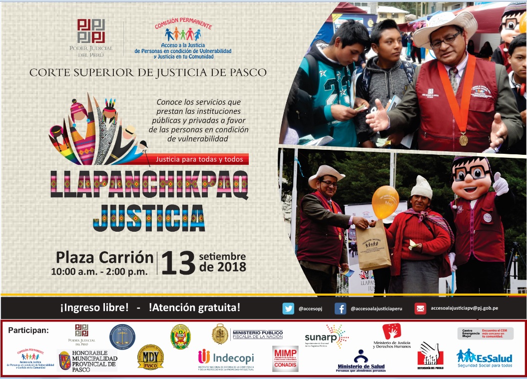 El Poder Judicial realizará una singular Feria Nacional Informativa Simultánea “Llapanchikpaq Justicia” Justicia para Todos, el 13 de setiembre, en Pasco al igual que en Lima y cada una de las 34 cortes superiores de justicia del país, a la que asistirán miles de personas.