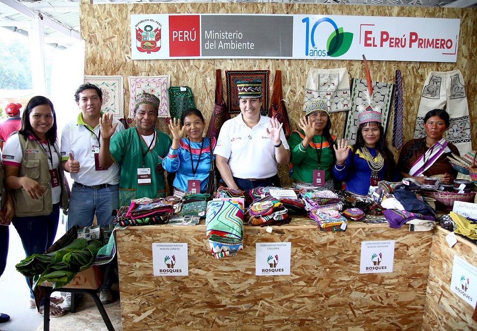 El stand del Minam+CAF y Programa Bosques del Ministerio del Ambiente presenta a comunidades nativas con experiencias exitosas sobre econegocios y conservación de bosques.