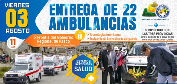 Cumplido con el informe final de peritaje y subsanado todo tema legal, el Gobierno Regional hará entrega 22 nuevas y modernas ambulancias rurales tipo II en favor de las Redes de Salud de Pasco, Oxapampa y Daniel Alcides Carrión. Distribución que se efectivizará por parte del Gobernador Teódulo Quispe este viernes 3 de agosto a partir de las 10 horas al frontis de la sede regional.