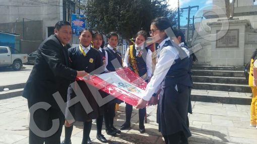 ALUMNAS DE LA INSTITUCIÓN EDUCATIVA EMBLEMÁTICA MARÍA PARADO DE BELLIDO LAVAN BANDERA EN PUERTA DE PODER JUDICIAL Y OTRAS INSTITUCIONES