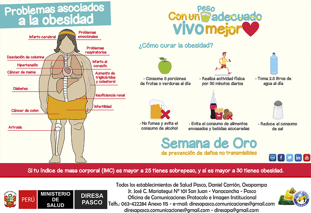 La Dirección Regional de Salud Pasco (DIRESA) recomienda a las personas realizar por lo menos 30 minutos de ejercicios físicos, alimentación saludable con verduras y frutas como una forma de prevenir enfermedades como la hipertensión arterial, diabetes, obesidad. Esto por la Semana de Oro de prevención de Daños no transmisibles del 22 al 28 de julio, cuyo fin es informar a la población sobre la importancia de prevenir estas enfermedades y promover la alimentación saludable y actividad física.
