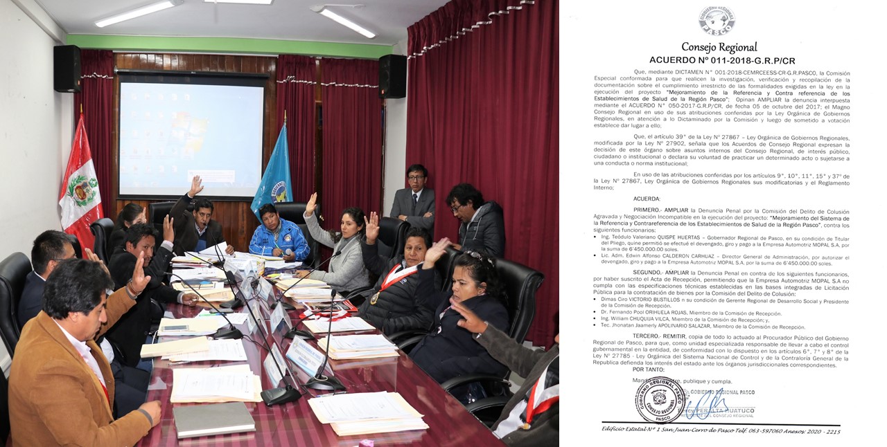 Luego de cumplir un trabajo responsable de investigación, verificación, y recopilación de documentos realizada por la Comisión Especial frente a laejecución del proyecto: Mejoramiento de la Referencia y Contra Referencia de los Establecimientos de Salud de la Región Pasco”, - adquisición de las 22 ambulancias rurales tipo II; el Consejo Regional, en su afán de el cautelar la ejecución de un gasto eficiente y los intereses del Estado, determinó mediante Acuerdo N° 005-2018-G.R.P/CR ampliar la Denuncia Penal por la Comisión de delito de Colusión Agravada y Negociación Incompatible, en contra de funcionarios responsables del Gobierno Regional de Pasco, entre ellos, el Gobernador Regional, Director General de Administración, quienes autorizaron devengar, girar y pagar la suma de S/. 6´450,000.00 nuevos soles a la Empresa Automotriz MOPAL S.A, de otro lado, ampliar la denuncia al Comité de Recepción quienes suscribieron el acta de recepción permitiendo que dicha empresa no cumpla con las especificaciones técnicas en las bases integradas de Licitación Pública para la contratación de bienes.