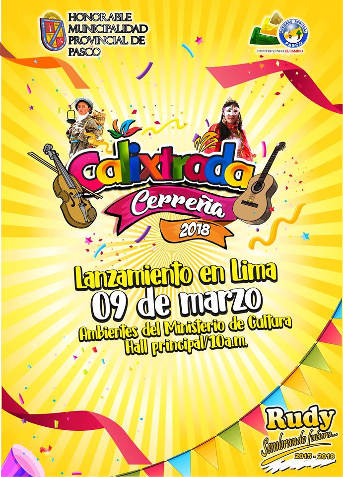 Con la finalidad de promocionar el evento cultural más grande de la región Pasco, el alcalde provincial, Rudy Callupe Gora en coordinación con el Ministerio de Cultura, desarrollarán la conferencia de prensa y el lanzamiento nacional de la versión 138 de la Calixtrada Cerreña 2018, en el Hall principal y explanada del Ministerio de Cultura, este viernes 09 de marzo a partir de las 10 de la mañana.
