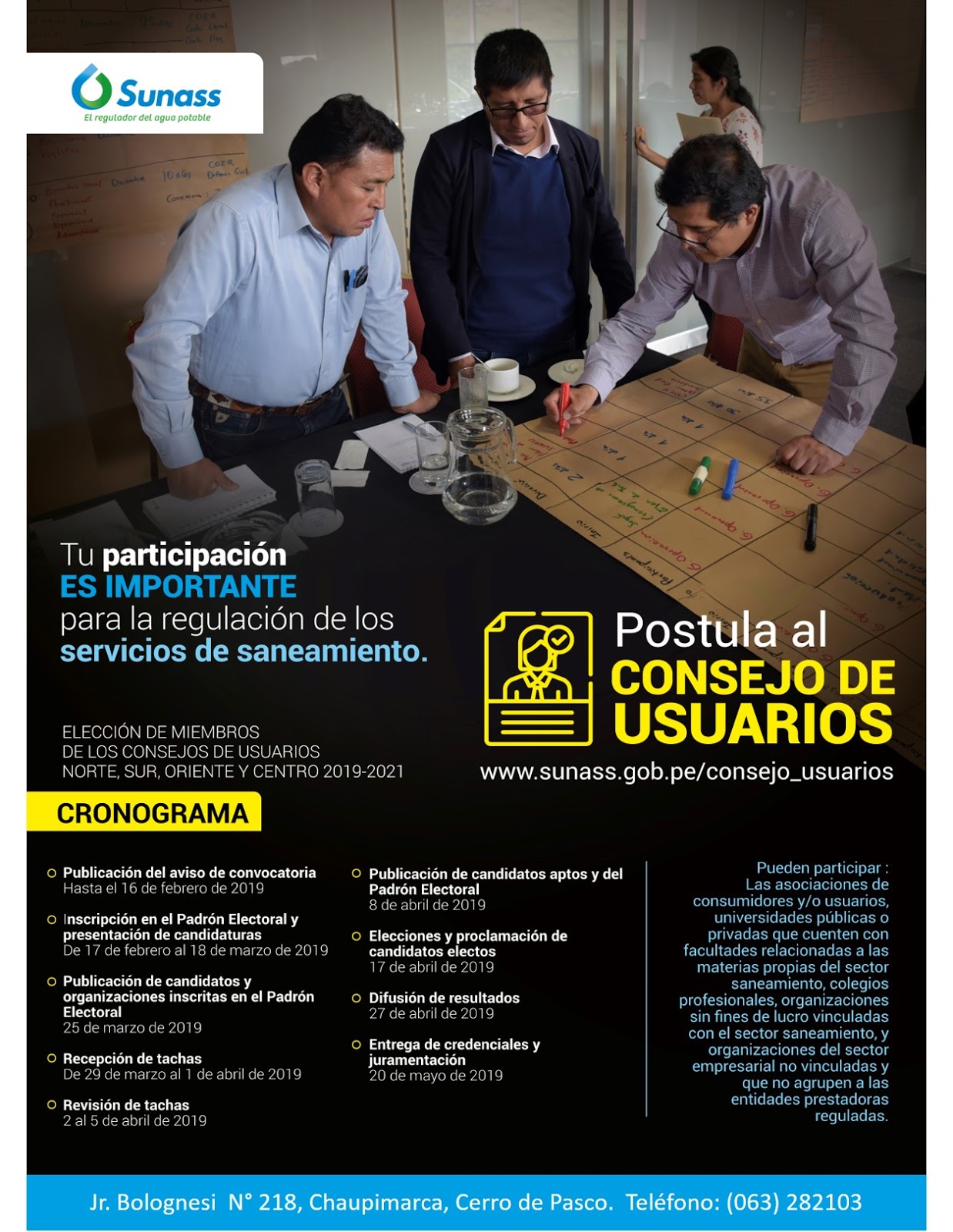 Pasco, 1 de marzo de 2019.- La Superintendencia Nacional de Servicios de Saneamiento (Sunass), de conformidad con el Reglamento de la Ley Marco de los Organismos Reguladores, invita a las organizaciones de la sociedad civil a participar en el proceso de elección de los miembros del Consejo de Usuarios Centro para el periodo 2019 – 2021.