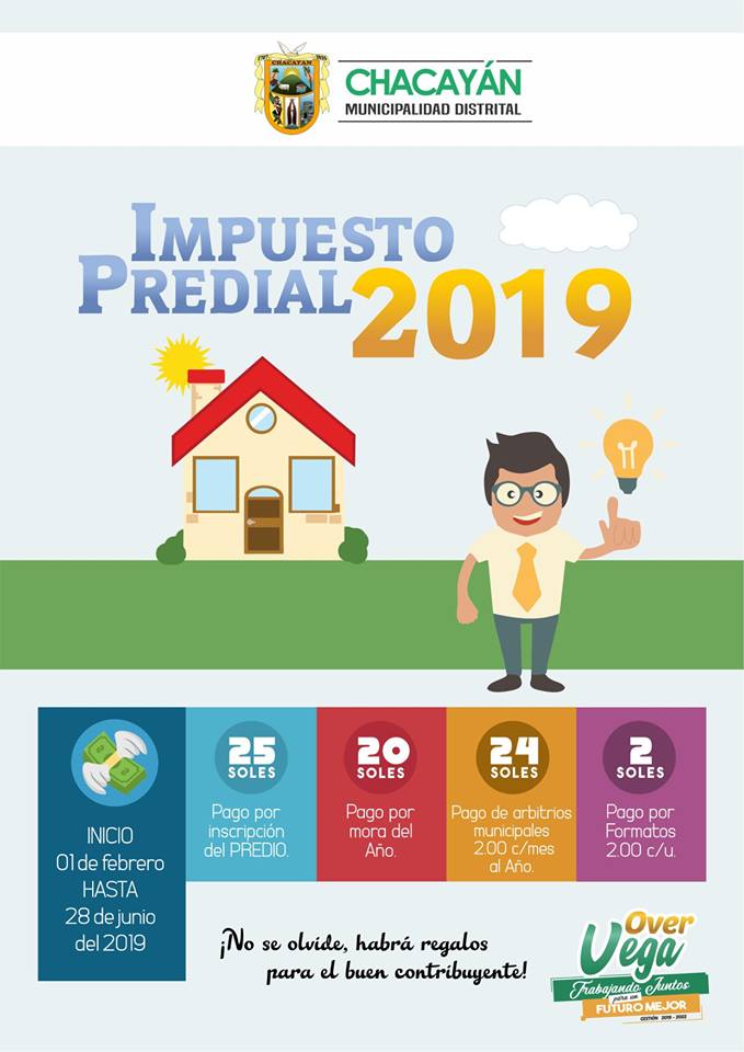 La Municipalidad Distrital de Chacayán viene ejecutando desde el 1 de febrero hasta el 28 de junio la campaña de “Impuesto Predial 2019”, con la finalidad de que el poblador pueda pagar sus impuestos con todas las facilidades y mejorar su la calidad de vida en cuanto a seguridad ciudadana, limpieza y orden.