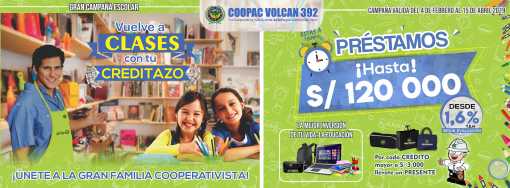 Coopac 392 a través de la Directiva N°001-2019-COOPAC LTDA. 392, lanza la gran campaña escolar “Vuelve a Clases con tu Creditazo 2019”, esta campaña tiene por finalidad Incrementar las colocaciones y número de Socios Nuevos, como también otorgar Créditos con beneficios diferenciados a nuestros socios y futuros socios, con facilidades documentarias.