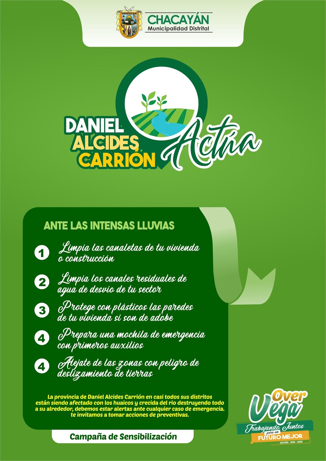 Frente al incremento de las lluvias dentro del distrito de Chacayán y casi toda la provincia Daniel Alcides Carrión, el burgomaestre chacayano Over Vega Prado, instó a la población a tomar medidas de precaución a través de la campaña denominada “Daniel Alcides Carrión ACTÚA”, esperando reducir en gran manera los daños con acciones preventivas.