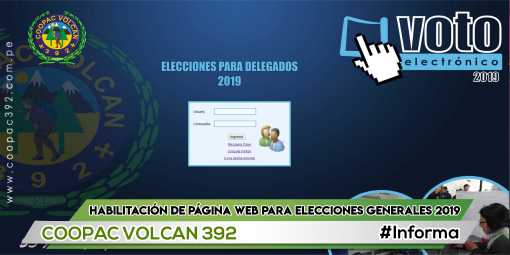 El Comité Electoral a través de su Presidente el señor Gregorio Gamarra Álvarez, anunció que a partir de hoy 22 de Enero del 2019 está habilitado la plataforma para las Elecciones Generales de Delegados vía internet de Coopac Volcan 392, mencionó que son 49 socios los postulantes que aspiran a ser los nuevos delegados para la magna representación de la Cooperativa más Grande de la Región del Perú, además que las elecciones se llevaran a cabo por 6 días del 22 al 26 de Enero por intermedio de la página web donde los socios podrán acceder con facilidad para emitir su voto, y el 27 de Enero de manera presencial de 8:00 am a 4:00 pm en instalaciones que corresponda el lugar de afiliación, asimismo recomendó a los socios que guarden las constancias de sufragio para posteriores reclamos en caso de inconvenientes.