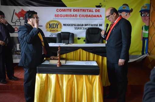 En la Sala de Regidores de la Municipalidad Distrital de Yanacancha, el presidente de la Corte Superior de Justicia de Pasco, Dr. David Ernesto Mapelli Palomino, juramento al Alcalde del distrito, Economista Omar Raul Razas Pascual, como presidente del Comité Distrital de Seguridad Ciudad de Yanacancha (CODISEC Yanacancha) para el ejercicio en el 2019.