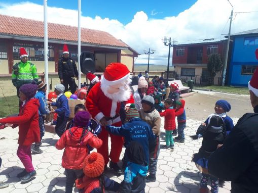 En un gesto de solidaridad, disfrazados de papa Noel, y payasitos, los efectivos de la Región Policial de Pasco y de la División de Investigación Criminal (DIVINCRI) Pasco, llevaron alegría a más de 600 niños y niñas de las localidades de Yanacancha, Pucuruhuay y Huariaca. En una muestra de solidaridad y acercamiento a la comunidad, obsequiaron juguetes y compartieron una chocolatada y panetones.