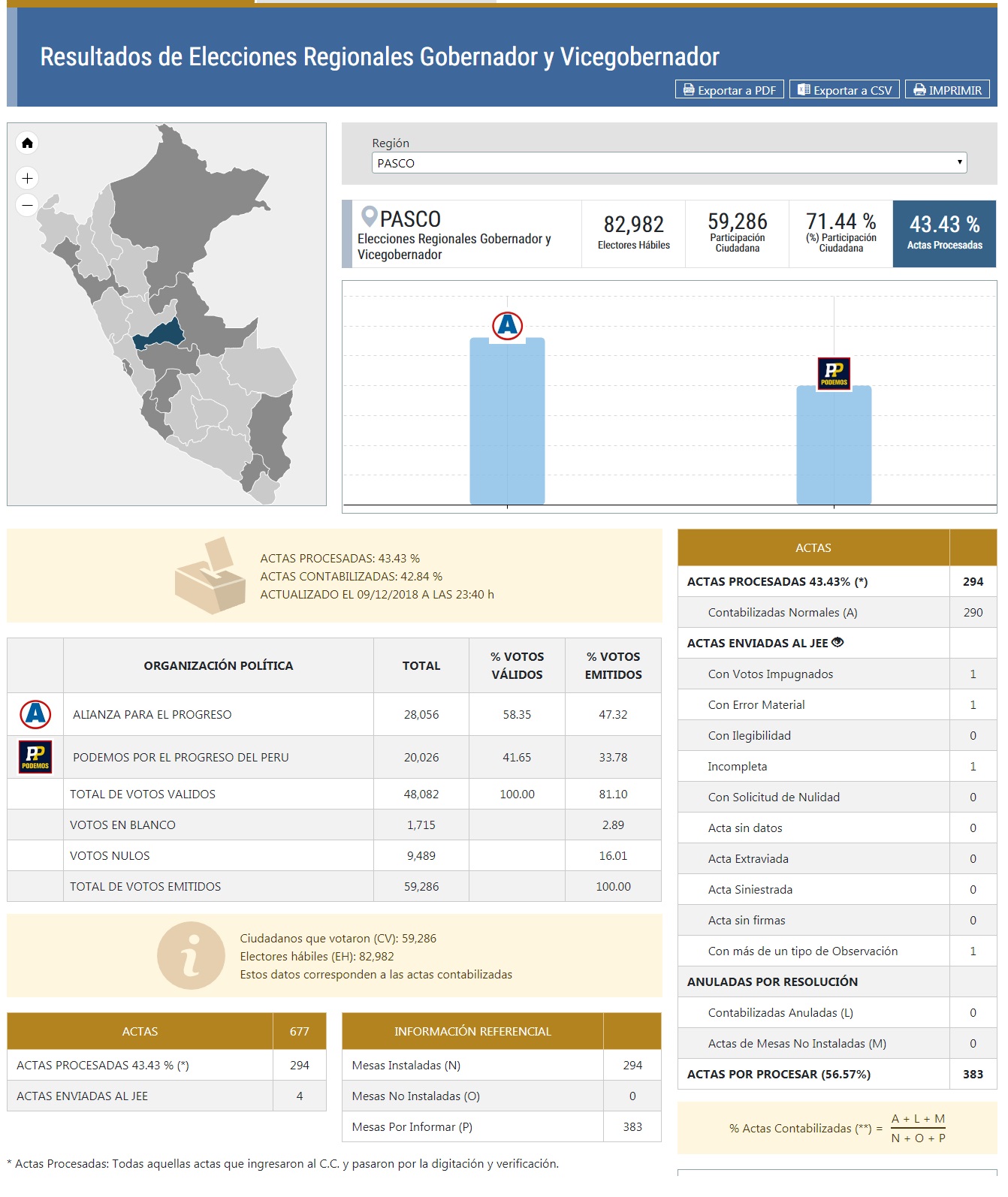 Con algunas pequeñas observaciones como el intento de una suplantación en Huachon, inicio de sufragio después de más de dos horas en algunas mesas por falta de miembros de mesas, se desarrolló las Elecciones Regionales en su Segunda Vuelta; resultando como virtual ganador Pedro Ubaldo Polinar quien obtuvo según avance de reporte de la Onpe a las 23:46 horas del lunes 10 de diciembre 2018 el 59.98% de los votos frente al 40.62% de Rudy Callupe Gora y el voto blanco 3,707 nulos 15,801 votos; notándose ausentismo de electores.