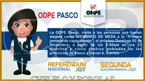 Como parte de la jornada electoral rumbo a las elecciones de Segunda Vuelta Regional y Referéndum Nacional 2018, este domingo 02 de diciembre se invita a los miembros de mesa y demás actores electorales, a la capacitación que organiza la Oficina Nacional de Procesos Electorales (ONPE), a través de la Oficina Descentralizadas de Procesos Electorales (ODPE), Pasco.