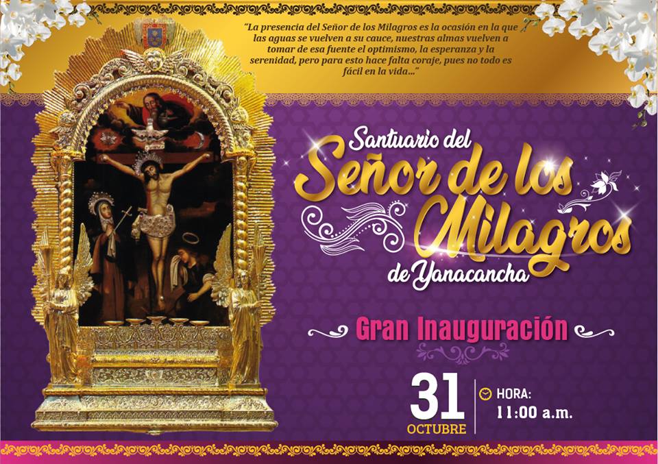 La presidenta de la hermandad mixta del señor de los Milagros del distrito de Yanacancha Doris Salazar Berríos, anunció que para este miércoles 31 de octubre se abrirán las puertas del Oratorio del Cristo de Pachacamilla ubicado en el asentamiento humano Techo propio.