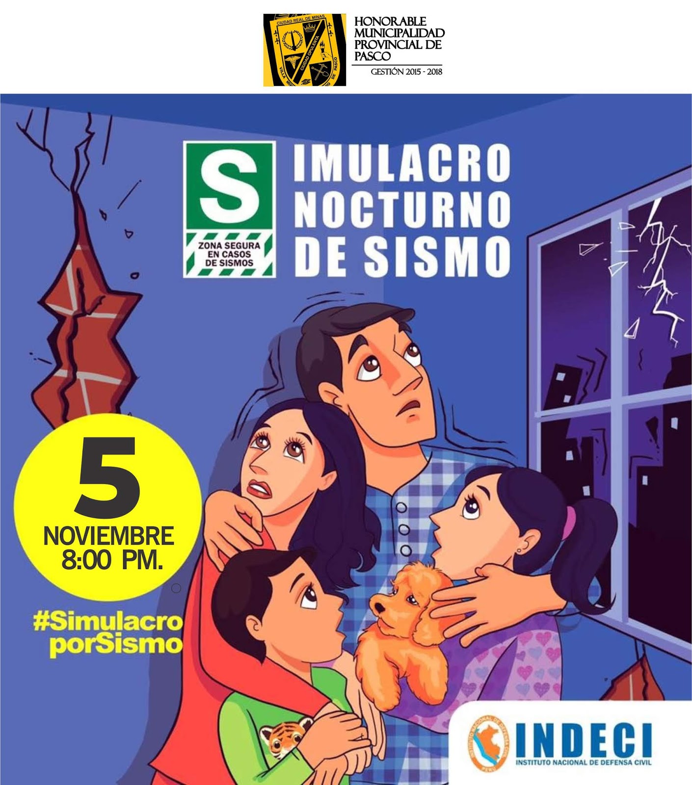 Con el propósito de promover una cultura preventiva y gestión de riesgo. La Honorable Municipalidad Provincial de Pasco a través de la Subgerencia de Gestión del Riesgo de Desastre, invita a la población pasqueña a participar de Simulacro por Sismo Nocturno, el 05 de noviembre a las 8 de la noche.