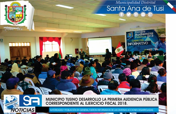 Con el objetivo de mantener pendiente de todos los trabajos y acciones que viene cumpliendo la Municipalidad Distrital de Santa Ana de Tusi, a través del soporte de información a los ciudadanos, el pasado sábado 28 de abril del presente año se desarrolló la Primera Audiencia Pública de Carácter Informativo de Rendición de Cuentas que corresponde al año fiscal 2018 .