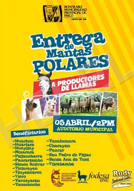 El alcalde de la Honorable Municipalidad Provincial de Pasco, Rudy Callupe Gora en trabajo conjunto con la Asociación de Productores de Llamas y la ONG Fodesa, lograron más de 1000 frazadas polares de parte de la Superintendencia Nacional de Aduanas y de Administración Tributaria (SUNAT), para las personas más vulnerables antes el friaje y heladas que afecta a la región Pasco.