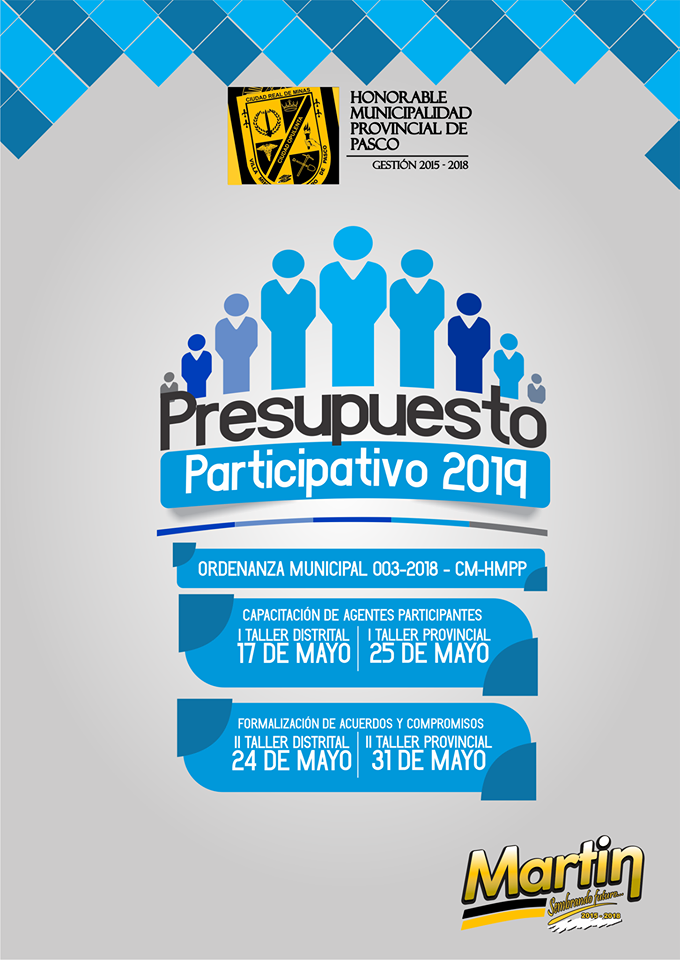La Honorable Municipalidad Provincial de Pasco, convoca al Presupuesto Participativo 2019, primer taller distrital será este 17 de mayo, mientras que el provincial será el 25, ambos en el auditorio municipal. Ello en cumplimiento a las normas vigentes y fortalecimiento de la democracia donde la población participa en las decisiones políticas de inversión en función a las prioridades y necesidades.