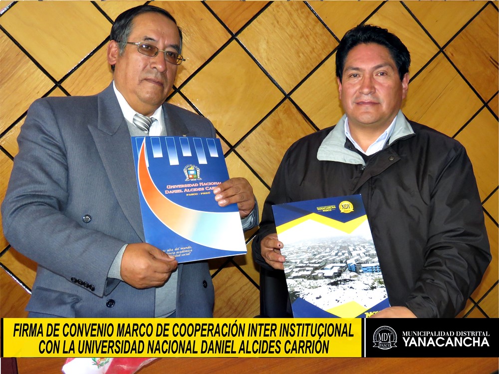 Hoy (18 de abril) al promediar la 12:00 pm. el alcalde de la Municipalidad Distrital de Yanacancha Mario Palacios Panez y el rector de la Universidad Nacional Daniel Alcides Carrión Dr. Felipe Yali Rupay, firmaron el convenio marco de cooperación interinstitucional que tiene por finalidad establecer una estrecha cooperación entre ambas instituciones, de manera que permita la ejecución de acciones conjuntas en pro del desarrollo socioeconómico del poblador Yanacanchino y Pasqueño.