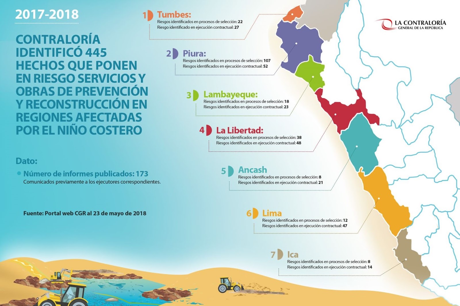 Prosiguiendo con su rol asesor y de acompañamiento al proceso de reconstrucción de las regiones afectadas por el fenómeno de El Niño costero, la Contraloría General identificó 445 hechos que podrían poner en riesgo servicios y obras implementadas en el marco de la Reconstrucción con Cambios en Tumbes, Piura, Lambayeque, La Libertad, Áncash, Lima e Ica desde setiembre 2017 a mayo de 2018.