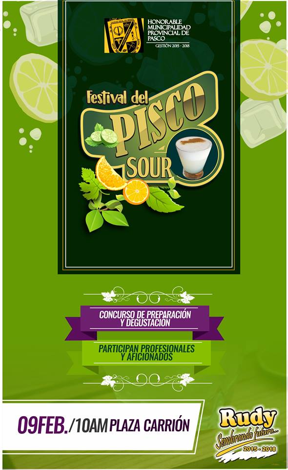 En el marco del Día Nacional del Pisco Sour, celebrado cada primer sábado del mes de febrero, la Oficina de Promoción Turística y Productiva de la Honorable Municipalidad Provincial de Pasco, realizará el festival y concurso de preparación del coctel bandera del país en la plaza Daniel Alcides Carrión.